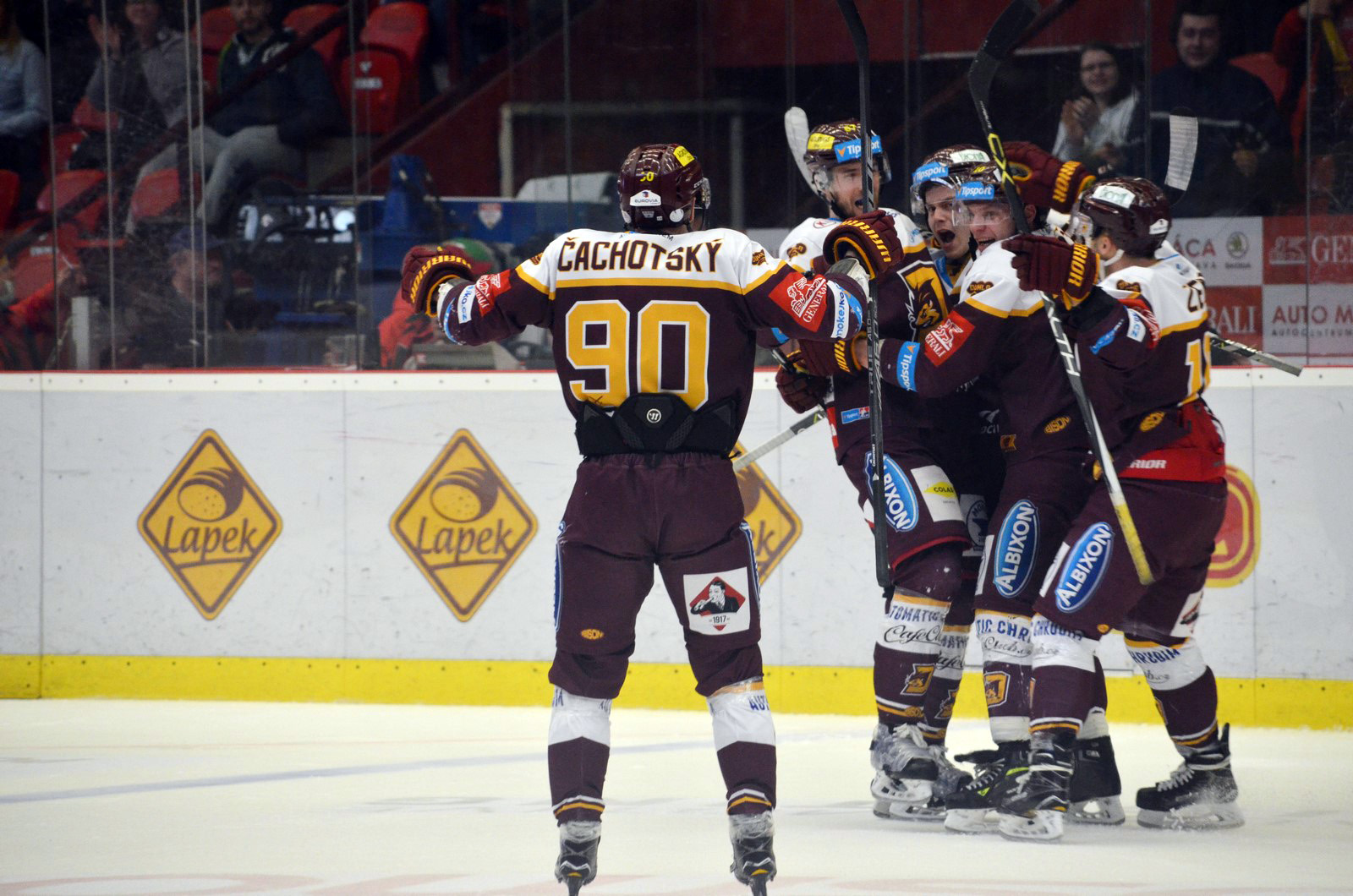 Poslední vzájemný mistrovský zápas odehrály oba celky 17. dubna 2018 v Litvínově v 10. kole baráže o extraligu. Dukla v 19. minutě vyrovnala Josefem Skořepou na 1:1 a v polovině zápasu dostal Jihlavu do vedení Filip Seman. Ještě sedm minut před koncem Dukla vedla 2:1, ale Litvínov dvěma brankami otočil zápas a udělal velký krok k záchraně Tipsport extraligy právě na úkor červenožlutých. Foto je ze zápasu, který se konal dva dny předtím, kdy Jihlava na Horáckém zimním stadionu porazila Litvínov 2:1 na nájezdy a jedním z úspěšných jihlavských exekutorů byl Tomáš Čachotský. Foto: Markéta Křížová