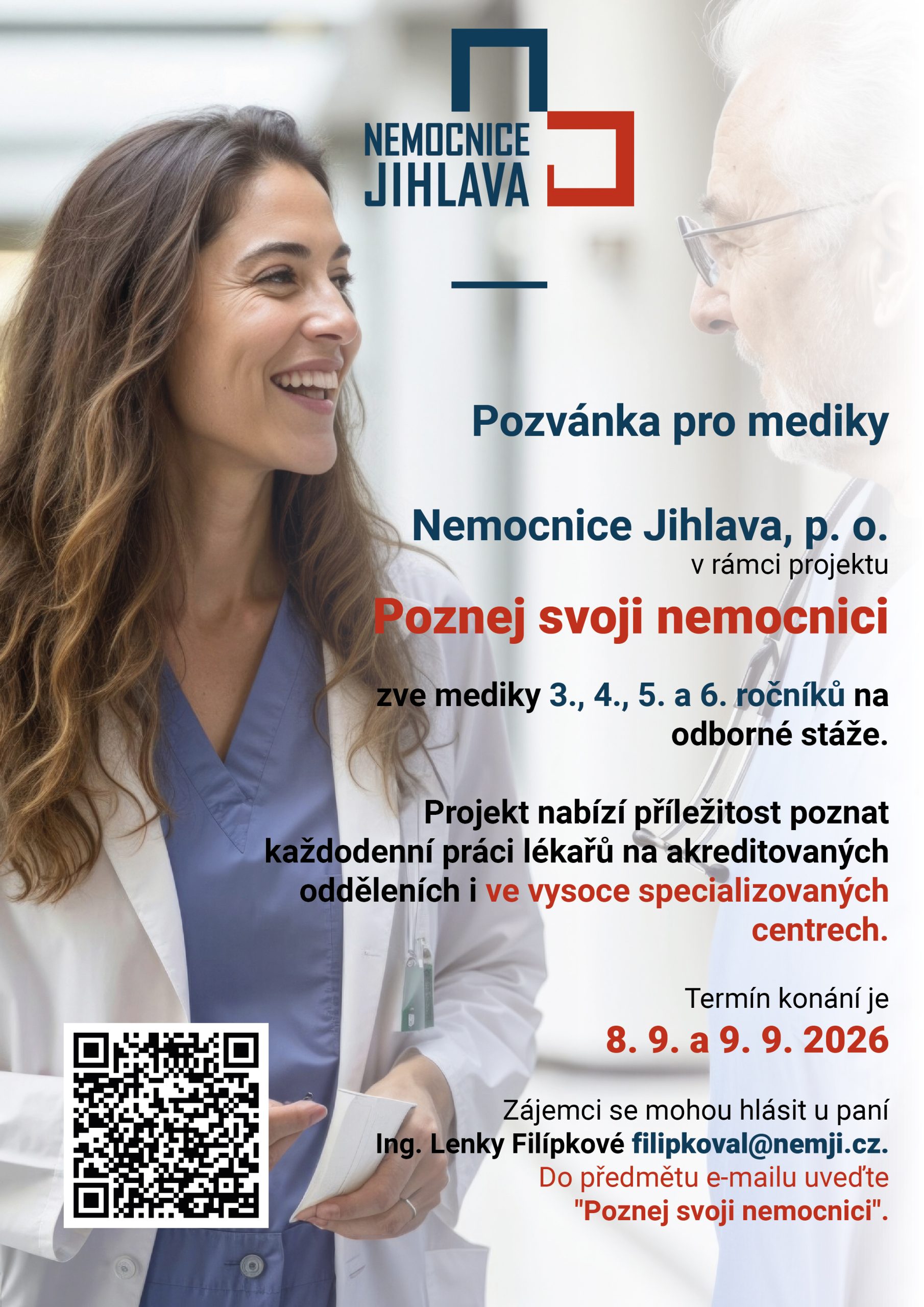 Nemocnice Jihlava zve mediky 3. , 4., 5. a 6. ročníků, v rámci projektu „Poznej svoji nemocnici“, na odborné stáže. Projekt nabízí příležitost poznat každodenní práci lékařů na akreditovaných odděleních i ve vysoce specializovaných centrech.