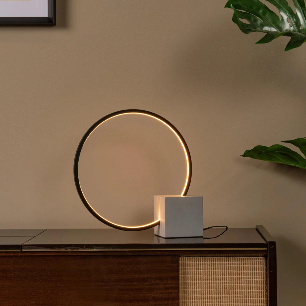 Cirkelis je geometrická poezie. Černý kruh s LED páskem na betonovém podstavci. Vypadá jako socha, svítí jako lampa. Stmívatelná, energeticky úsporná a vizuálně naprosto jedinečná. Tohle je konverzační kousek – hosté se budou ptát, kde jste ji sehnali.