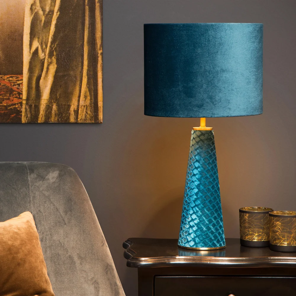 Velvet v modré je pro odvážné. Sametové stínidlo, šupinatá keramická noha s metalickým efektem, zlaté detaily. Tohle není lampa do pozadí – tohle je hlavní hvězda místnosti. Hodí se do interiérů, kde se nebojíte kombinovat styly a barvy.